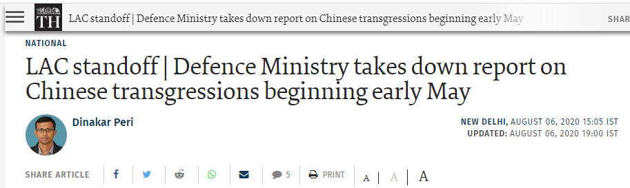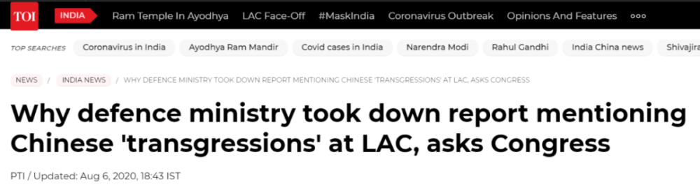 据《印度教徒报》的报道,这份被印度国防部悄悄撤下的报告,其内容主要是将今年6月中印边境冲突的责任怪给中方,称是中国在今年5月初“单方面入侵了属于印度的拉达克东部地区”,并持续激化事态,才导致了后来激烈的边境冲突。