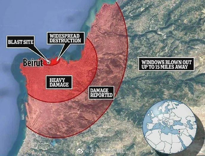 根据黎巴嫩当地媒体的地图绘制显示,深红色是完全摧毁,红色是严重破坏,浅红色是存在破坏。整个贝鲁特市区几乎都被波及了,爆炸中心15英里外的窗户玻璃都被震碎了。