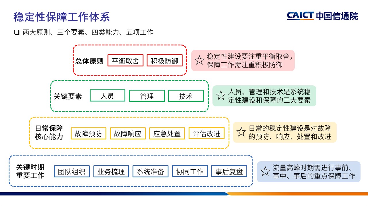 本次发布的《信息系统稳定性保障能力建设指南(1.0)》是国内首个全方位梳理总结稳定性保障相关实践经验、方法论的研究成果。指南梳理了新阶段下信息系统稳定性保障能力建设工作的相关背景、基本原则、关键要素、核心能力以及评价体系,汇总了互联网、电信、金融等领域头部企业的稳定性保障实践经验,探讨了稳定性保障工作的未来发展趋势。该指南开创性地提出了数字化时代下的信息系统稳定性保障体系,共包含“两个总体原则、三个关键要素、四类核心能力、五项重要工作”,为各方稳定性建设工作提供参考,帮助各行业完善软件系统稳定性保障体系。