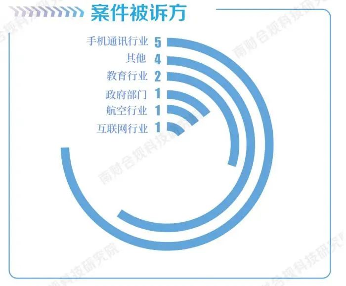 案件被诉方涉及的行业可大致分为6类,其中涉及手机通讯行业的案件数最多,共有5起;涉及教育行业的有2起;涉及政府部门、航空行业及互联网行业的各有1起。此外,还有4起涉及其他行业。