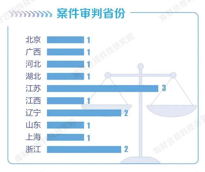 此次分析的14起个人信息保护公益诉讼案例主要涉及6个省份,其中在江苏省审判的案件数量最多,有3起;辽宁省、浙江省次之,均为2起。具体来看,江苏省的案例是在扬州市、启东市、淮安市淮阴区提起公益诉讼并审判。